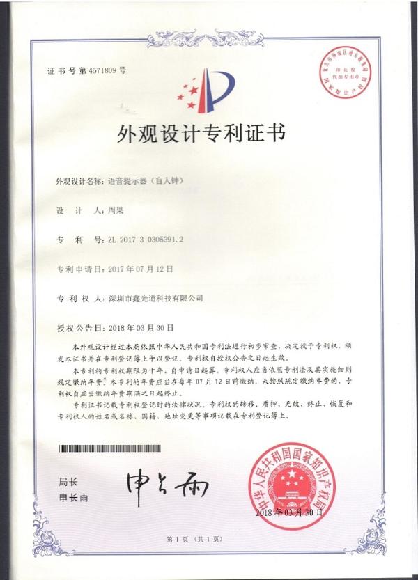 外观设计名称:语音提示器(盲人钟) 设计人:周果 专利号:ZL 2017303053912 专利申请日:2017年07月12日 专利权人:太阳成集团tyc7111cc,太阳集团tyc4633,太阳集团tyc9728
