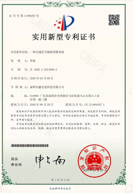• 发明专利证书-一种交通信号辅助装置