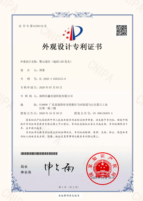 外观设计名称:警示道钉(地面LED发光) 设计人:周果 专利号:ZL 2020 3 0353315.0 专利申请日:2020年07月03日 专利权人:太阳成集团tyc7111cc,太阳集团tyc4633,太阳集团tyc9728