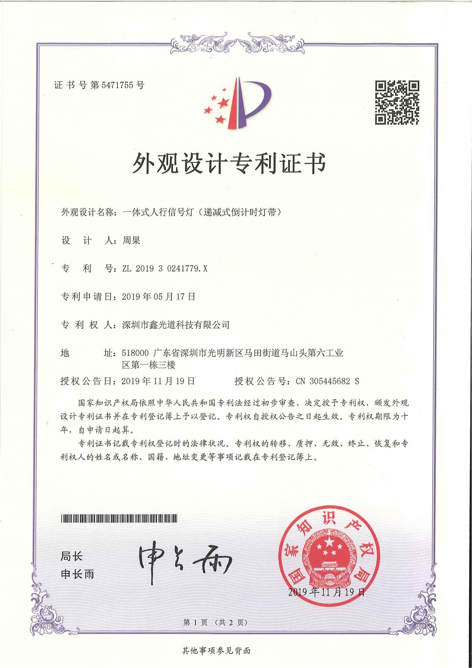 外观设计名称:一体式人行道信号灯(递减式倒计时灯带) 设计人:周果 专利号:ZL 2019 3 0241779.X 专利申请日:2019年05月17日 专利权人:太阳成集团tyc7111cc,太阳集团tyc4633,太阳集团tyc9728