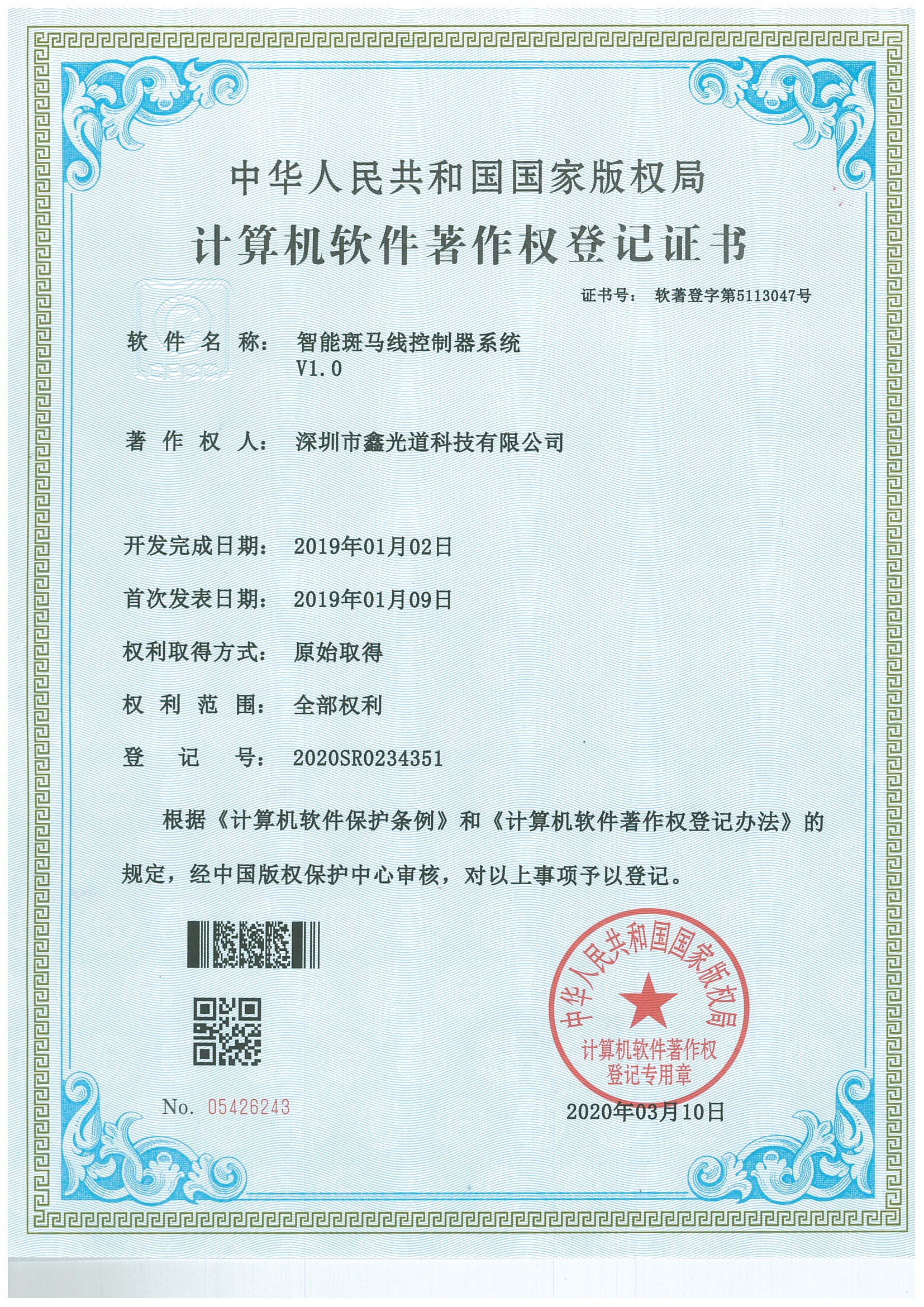 中华人民共和国国家版权局计算机软件著作权登记证书 软件名称: 智能斑马线控制系统V1.0 著作权人: 太阳成集团tyc7111cc,太阳集团tyc4633,太阳集团tyc9728 开发完成日期: 2019年01月02日 首次发表日期: 2018年01月09日 权利取得方式: 原始权利 权利范围: 全部权利 登记号: 2020SR0234351 根据《计算机软件保护条例》和《计算机软件著作权登记办法》的规定,经中国版权保护中心审核,对以上事项予以登记。