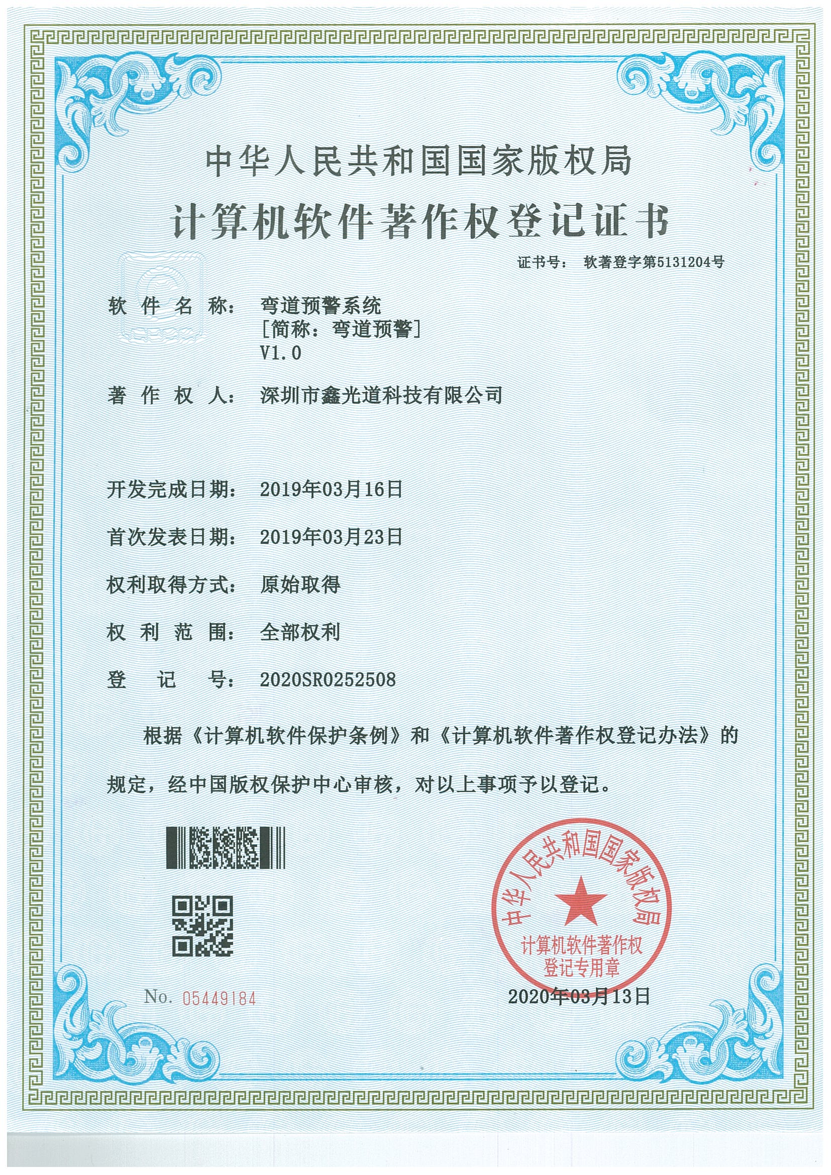 中华人民共和国国家版权局计算机软件著作权登记证书 软件名称: 弯道预警系统 [简称: 弯道预警] v1.0 著作权人: 太阳成集团tyc7111cc,太阳集团tyc4633,太阳集团tyc9728 开发完成日期: 2019年03月16日 首次发表日期: 2019年03月23日 权利取得方式: 原始权利 权利范围: 全部权利 登记号: 2020SR0252508 根据《计算机软件保护条例》和《计算机软件著作权登记办法》的规定,经中国版权保护中心审核,对以上事项予以登记