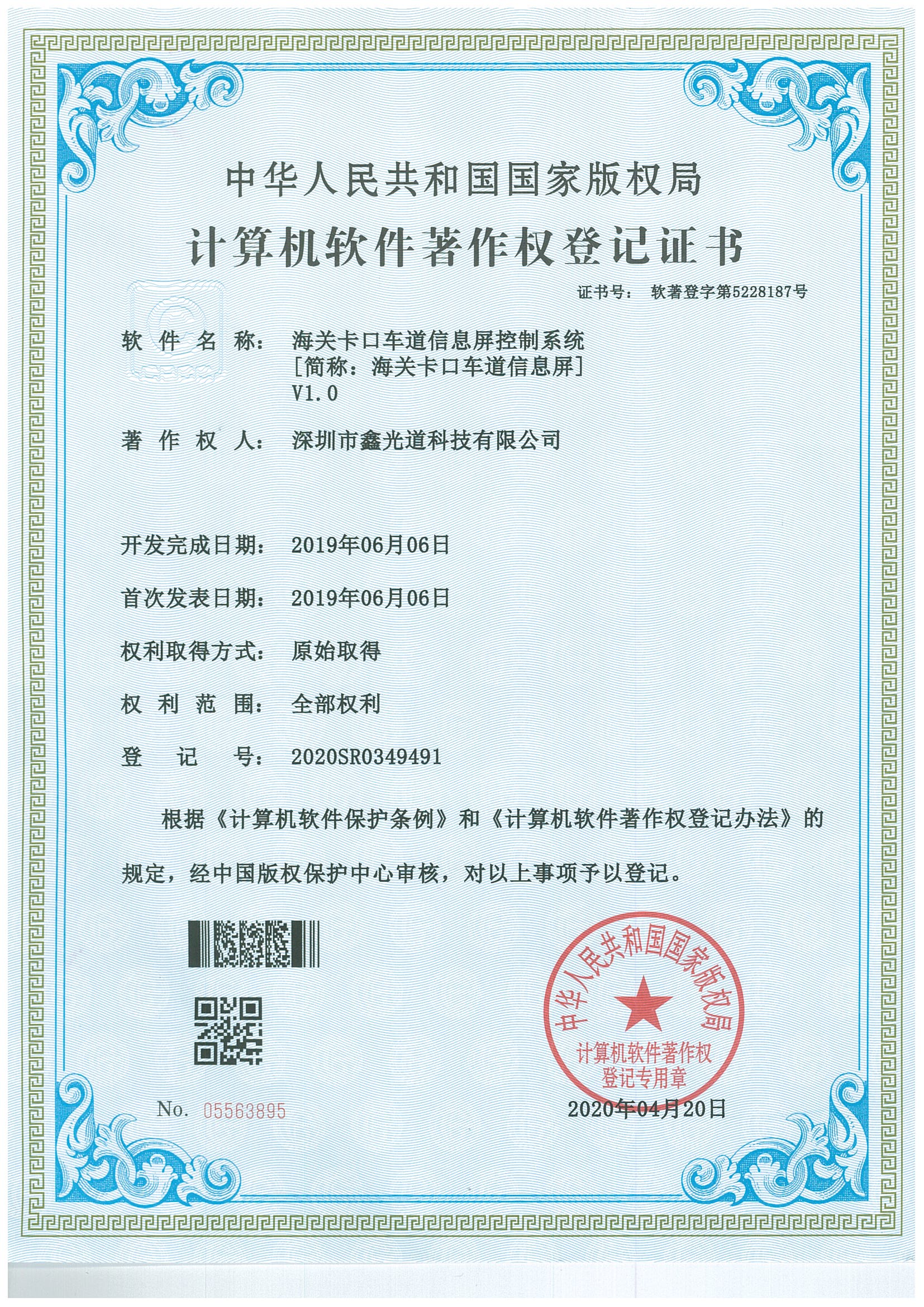中华人民共和国国家版权局计算机软件著作权登记证书 软件名称: 海关卡口车道信息屏控制系统{简称:海关卡口车道信息屏}V1.0 著作权人: 太阳成集团tyc7111cc,太阳集团tyc4633,太阳集团tyc9728 开发完成日期: 2019年06月06日 首次发表日期: 2019年06月06日 权利取得方式: 原始权利 权利范围: 全部权利 登记号: 2020SR0349491 根据《计算机软件保护条例》和《计算机软件著作权登记办法》的规定,经中国版权保护中心审核,对以上事项予以登记