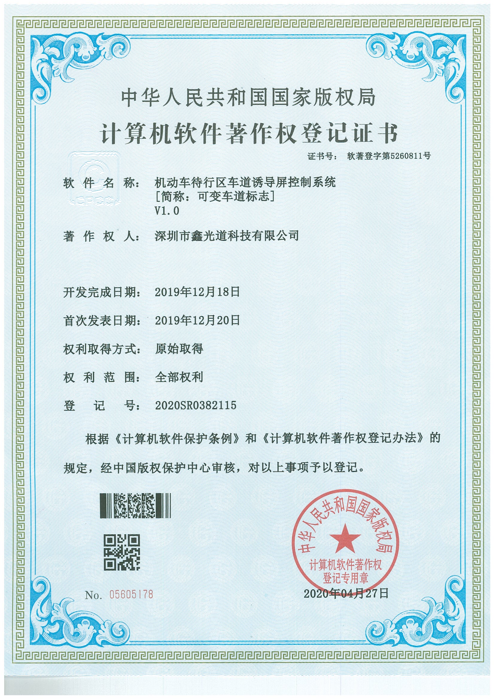 中华人民共和国国家版权局计算机软件著作权登记证书 软件名称:机动车待行区车道诱导屏控制系统[简称: 可变车道标志]V1.0 著作权人: 太阳成集团tyc7111cc,太阳集团tyc4633,太阳集团tyc9728 开发完成日期: 2019年12月18日 首次发表日期: 2019年12月20日 权利取得方式: 原始权利 权利范围: 全部权利 登记号: 2020SR0382115 根据《计算机软件保护条例》和《计算机软件著作权登记办法》的规定,经中国版权保护中心审核,对以上事项予以登记