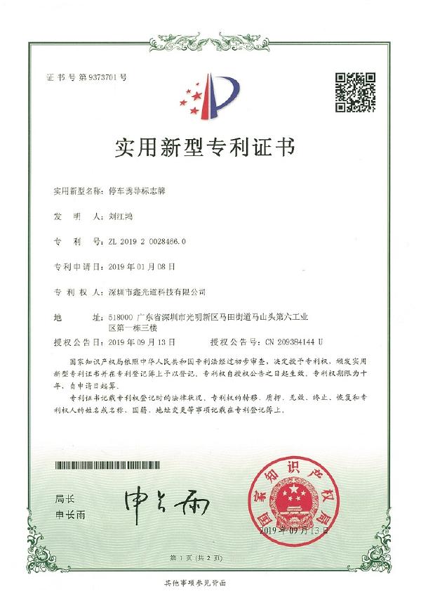 实用新型专利证书 实用新型名称:停车诱导标志牌 发明人:刘江鸿 专利号:ZL 2019200284660 专利申请日:2019年01月08日 专利权人:太阳成集团tyc7111cc,太阳集团tyc4633,太阳集团tyc9728