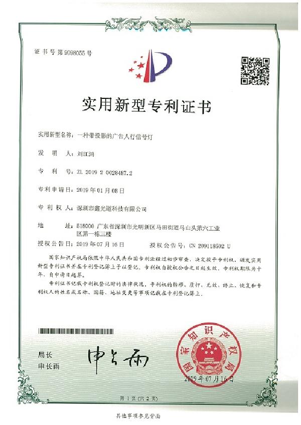 实用新型专利证书 实用新型名称:一种带投影的广告人行信号灯 发明人:刘江鸿 专利号:ZL 2019200284872 专利申请日:2019年01月08日 专利权人:太阳成集团tyc7111cc,太阳集团tyc4633,太阳集团tyc9728