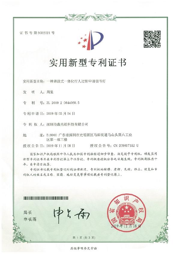 实用新型专利证书 实用新型名称:一种路段式一体化行人过街申请信号灯 发明人:周果 专利号:ZL 2019206440605 专利申请日:2019年05月04日 专利权人:太阳成集团tyc7111cc,太阳集团tyc4633,太阳集团tyc9728