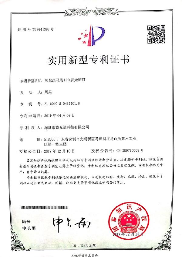 实用新型专利证书 实用新型名称:智慧斑马线LED发光道钉 发明人:周果 专利号:ZL 2019204674016 专利申请日:2019年04月09日 专利权人:太阳成集团tyc7111cc,太阳集团tyc4633,太阳集团tyc9728