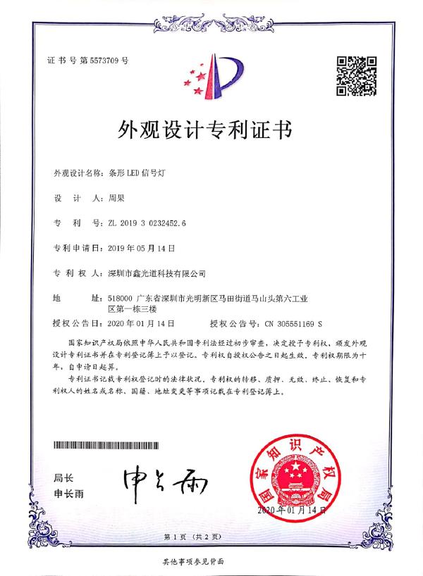 外观设计名称:条形LED信号灯 设计人:周果 专利号:ZL 2019302324526 专利申请日: 2019年05月14日 专利权人:太阳成集团tyc7111cc,太阳集团tyc4633,太阳集团tyc9728