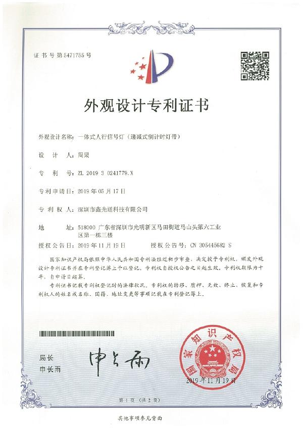 外观设计名称:一体式人行信号灯(递减式倒计时灯带) 设计人:周果 专利号:ZL 201930241779X 专利申请日:2019年05月17日 专利权人:太阳成集团tyc7111cc,太阳集团tyc4633,太阳集团tyc9728