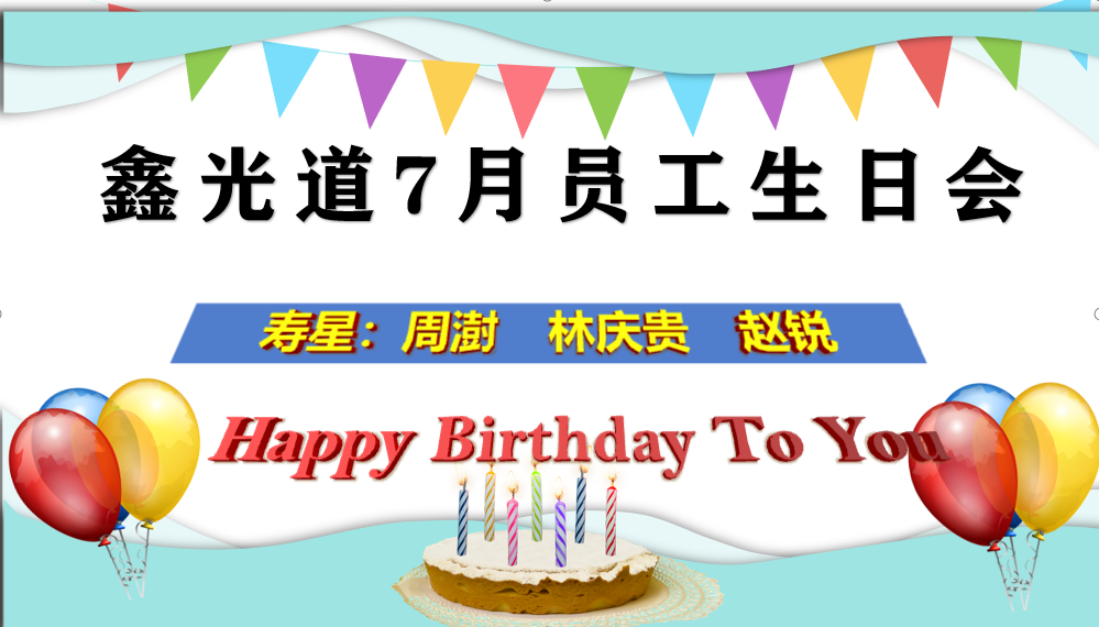 鑫光道7月份员工生日会 七月迈着它那骄傲的步伐向我们走来,一个火热难当的夏季正在启动它的所有情怀。盛夏,看鸟儿忙个不停,在空中唱着歌丈量天空的长度;盛夏,听蝉鸣的声音此起彼伏,看河水清澈流音悠长。 2021年7月29日,每月一度的鑫光道员工生日会如期举行,在生日会现场,公司为本月寿星准备了醇香四溢的大蛋糕和各种新鲜水果,全体员工为他们送上了生日祝福,寿星们也许下了美好的生日愿望,此刻,你们就是最幸福的人! 没有鲜花,却有掌声,没有美