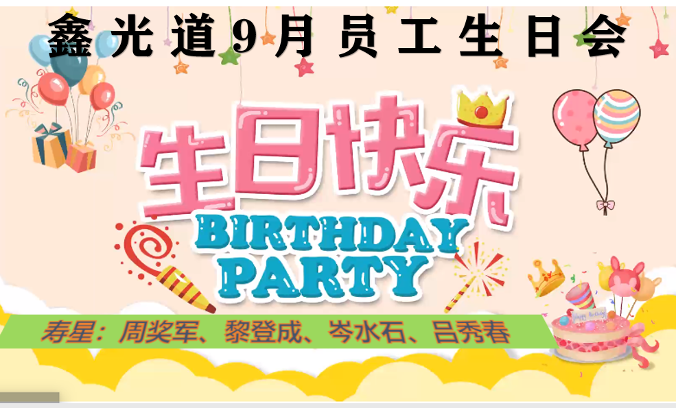 鑫光道9月份员工生日会 一个人的生日是自得其乐, 一群人的生日就是其乐无穷。 鑫光道的九月生日会, 在大家的欢声笑语中, 如期而至。 本月有四位寿星生日! 美味的蛋糕、真诚的祝福、 爽朗的笑声、温暖的笑脸... 都深深的记录在镜头中, 定格在每一个鑫光道员工的记忆中。 当祝福声萦绕耳际, 当烛光星星点点, 映照着每一张欢乐的脸庞, 仿佛每