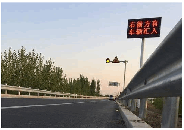 车辆在距离路口大约300至400米的位置时,如果有行人过路口就会触发检测设备,这时用于预警的显示屏闪亮,组成行人过街轨迹的地灯也会闪亮。若此时车载电台处于开启状态,电台信号会自动强制插入“前方路口有行人,通过请减速慢行”的提示音。与此同时,如果经过系统逻辑判断,主路上来向有车辆行驶且有撞上过路行人的可能性,就会同步对过路的行人进行提醒,设置于路口的扩音装置也会发出声音“左侧来车,注意避让”,设置在路口的警示屏同时闪烁同样提示内容的文字信息,对行人进行提醒。若无行人过街,所有的设备均不会触发,不会对车辆通行造成任何影响。
