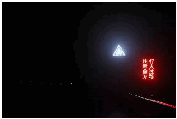 此时,前方300米的一个路口,一名行人正从村庄道路踏上路口。伴随着行人走到路口,路旁的一块警示屏出现“注意前方行人过路”的提示和路口地面斑马线上的地灯也开始闪亮,明确显示出过街路口的斑马线轨迹,并发出了“左前方有车辆驶来,注意过路安全”的提示声。