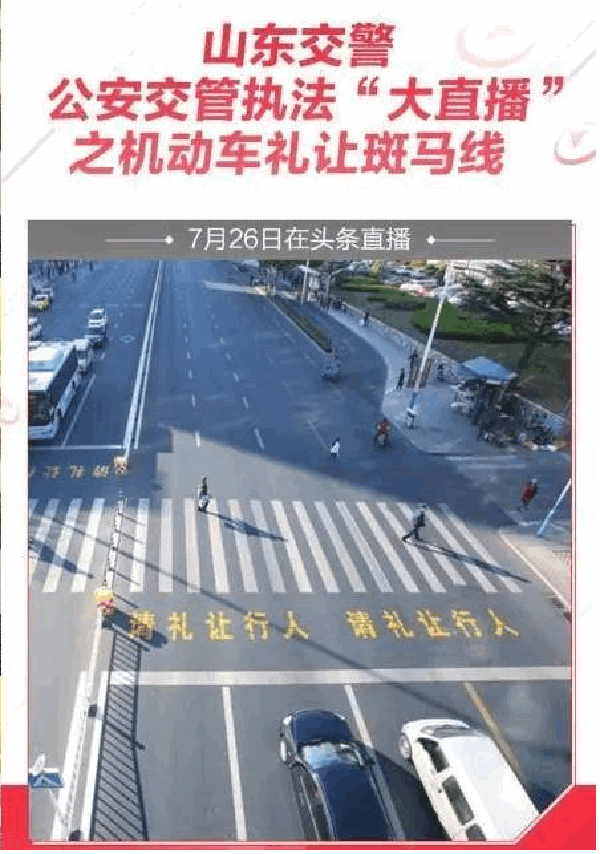 7月26日,山东省公安厅交通管理局联合“今日头条”政务头条号,开展“公安交管执法‘大直播’之机动车礼让斑马线”活动。山东省32个一线交管部门,通过对不礼让斑马线现场劝导和执法整治,在全社会营造“礼让行人、文明出行”的浓厚氛围。