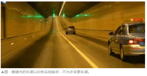 禁止变更车道。一般情况下,隧道内的车道都是以白色单实线施划的,这就意味着在隧道内并不允许变换车道。同时,除了车辆发生不可移动的故障要设置警示标志停车外,其它情况下一概不允许隧道停车。