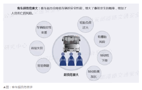 制动性能下降,刹车距离延长。超员改变了制动力在各轴之间的合理分配,容易导致制动距离变长、制动时转向失效、车辆甩尾等方面的事故。