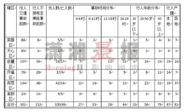 芙蓉区人民路(德政园地段、韶山路口)、岳麓区西二环(梅溪湖桥南口地段、汽车西站路段、王家湾地段、西站加气站地段、天麓驾校路段、王家湾立交桥西端下坡地段)等路段行人不按规定横路造成事故率较多。