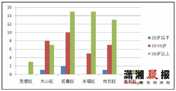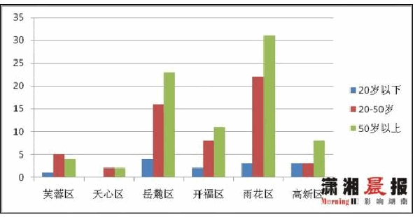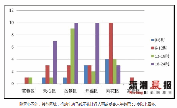 从全市城区行人不按规定横路事故当事人年龄分布情况来看,除芙蓉区、天心区受害人主要分布在 20 岁以上外,其他区域,行人不按规定横路事故当事人年龄以 50 岁以上居多。