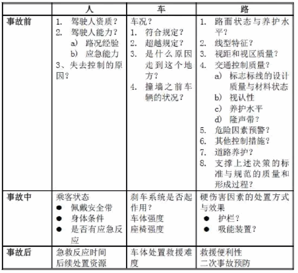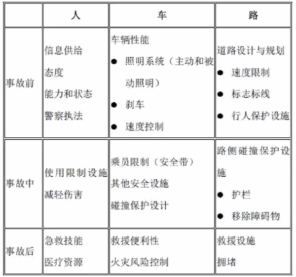 在交通安全对策研究领域,有一个经典的模型——“哈顿矩阵”,威廉哈顿先生在担任美国第一任道路与车辆交通安全管理局局长时首创了这个矩阵,他指出,交通事故的结果与诱因之间具有广泛而复杂的联系,不是简单追责哪个方面就可以改善道路安全条件的.