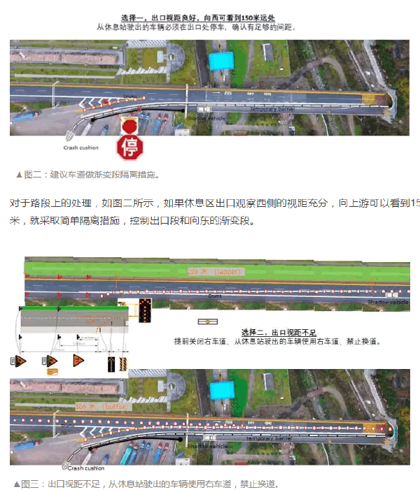 如果休息区出口向西的方向视距不足,如图三所示,就要在出口的上游实施渐变隔离,让休息区出口车辆只使用一条车道直接进入隧道。避免主路上驶来的车辆与驶离休息区的车辆因速度不同而发生交织冲突,引发快速行驶的车辆冒险超车。