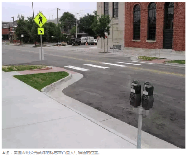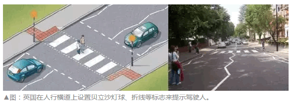 在国外,例如英国,人行横道前的提醒通常会通过人行横道特有的标志标线来体现,如采用贝立沙灯球、折线等进行特殊标识,全国统一,便于辨识;美国则采用荧光黄绿的标志来凸显人行横道的位置,有时会将人行横道标志做大一号,便于驾驶人发现。人行横道要清晰明确,颜色过多或者太炫太亮,都会形成干扰,不利于驾驶人注意行人。