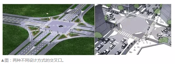 下面左图是国内教科书和指南经常推荐的形式,这种设计方法是否安全有待论证,右图的设计对行人来说是安全友好型的。