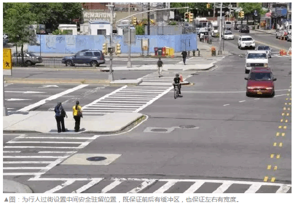 对于交叉口的设置,国内的规范通常会只考虑机动车的需求,极少会考虑行人、非机动车的需求。譬如,交叉口规范里通常有展宽的要求,这恰恰和行人的需求相反。在交叉口的转弯上,规范对行人安全的控制也缺少说明,尤其在许多教科书或指南里,会鼓励做放行右转车辆的拐角渠化岛,而实际上,右转车辆还对行人形成很大的威胁。