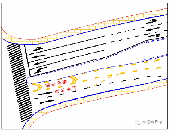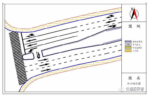 由于交叉口所处位置较为特殊,东口接着跨线桥,无法进行路口拓宽处理,其他进口已进行最大限度的拓宽。具体交叉口情况如图所示
