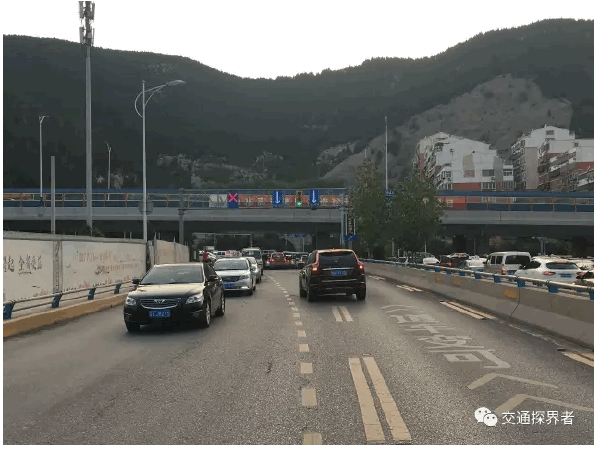 东口跨线桥东端距桥30米处道路中心线开口用于车辆变道至潮汐车道,并在潮汐车道进口处设置诱导装置用于引导车辆进入潮汐车道行驶。路段设置潮汐车道,桥上施划潮汐车道地面标线。距交叉口50米处在潮汐车道的基础上增设逆向可变车道,并在距交叉口35米处设置诱导装置引导车辆进入逆向可变车道。