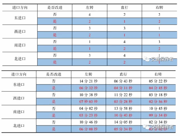 改进前后交叉口各进口停车次数、通过时间对比表