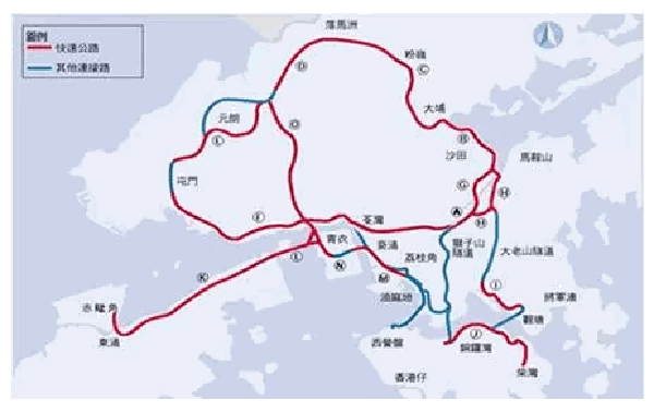 香港公路总长超过两千公里,汽车保有量已超70万辆。由于受到两广丘陵地形影响,香港道路路网看起来非常庞杂。快速公路是香港的主干道路,同时也是高速道路,2016年底总长度已经超过两百公里,占全部路网的1/10。