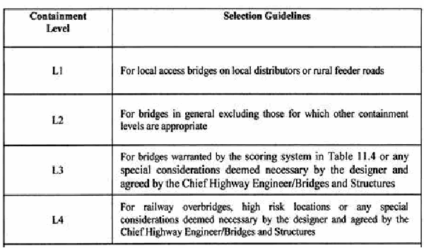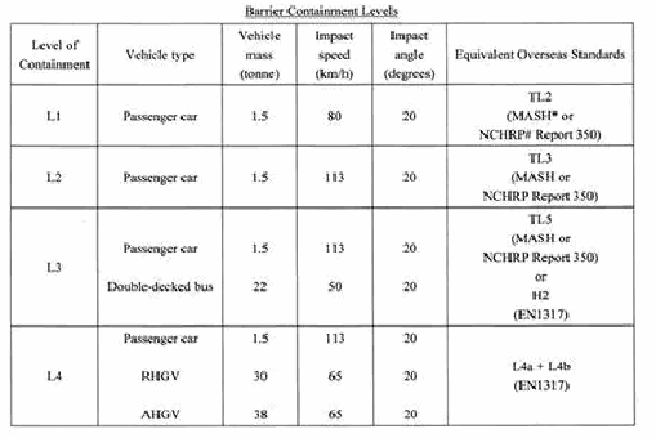桥梁护栏也分为四个级别,与道路护栏情况类似。从下表中得知,大部分桥梁需要使用L2级别护栏;如果桥梁上通过的双层大巴比较多,需要使用L3级别护栏;当桥梁跨越铁路等重要设施时,需要使用L4级别护栏。L4级别护栏全部采用水泥混凝土结构,高度设计在1.5米或以上。