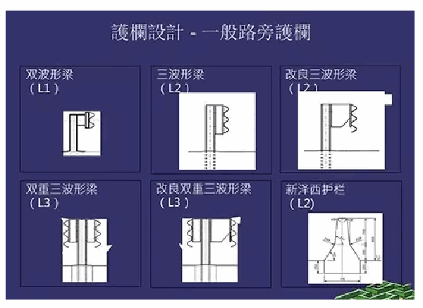 一般路旁护栏主要是两波板、三波板的钢铁横梁,使用情况与大陆相似。当车辆与护栏发生碰撞时,护栏会变形,所以我们在设计护栏时留有一个“block-out”,即护栏向外撑出去一部分,避免车辆撞击护栏时,车轮被护栏的立柱阻挡而导致急停。如下图,与其他护栏不同的是新泽西护栏,主要由水泥混凝土和钢铁横梁构成,有一些三波板是L2级别,有一些是L3级别,在碰撞的时候能够有效承载双层大巴。