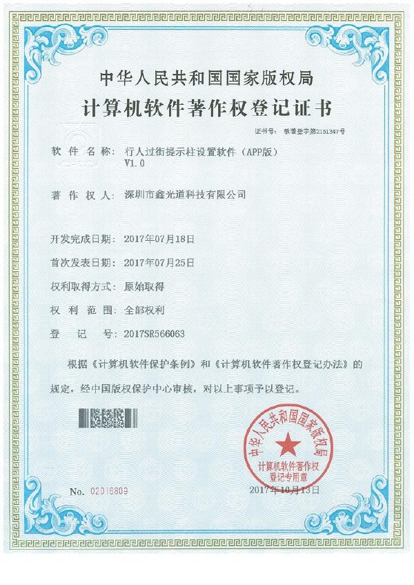 中华人民共和国国家版权局计算机软件著作权登记证书 软件名称:行人过街提示柱设置软件(APP版) 著作权人:太阳成集团tyc7111cc,太阳集团tyc4633,太阳集团tyc9728 开发完成日期:2017年07月18日 首次发表日期:2047年07月25日 权利取得方式:原始取得 权利范围:全部权利