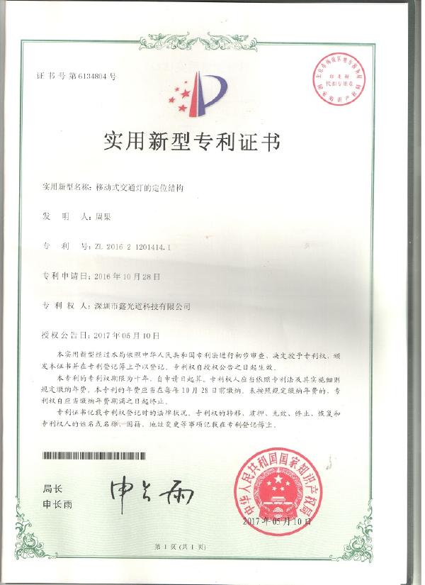 实用新型专利证书 实用新型名称:移动式交通灯的定位结构 发明人:周果 专利号:ZL2016212014141 申请日期:2016年10月28日 专利受权人:太阳成集团tyc7111cc,太阳集团tyc4633,太阳集团tyc9728 授权公告日:2017年05月10日