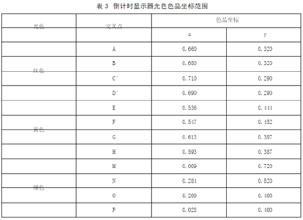 答:LED倒计时显示器发出光色的色品坐标应在下列表3中的规定范围内: