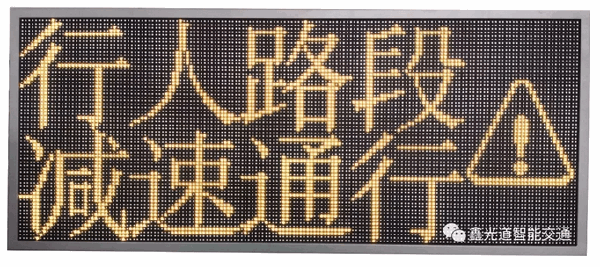 机动车道诱导屏显示“行人路段,减速通行”字样及三角标志闪烁警示提示