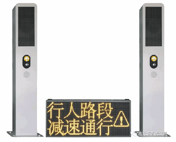 设备感应器检测到行人等候区域有行人接近时,行人提示屏启动,显示“行人过街,请按按钮”文字,并同步发出“行人过街,请按按钮”的语音提示,形象生动