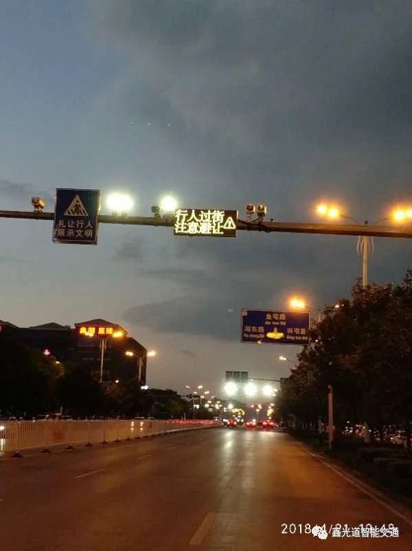 机动车道诱导屏显示“行人过街,注意避让”字样及三角标志闪烁警示提示