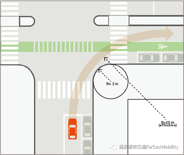长期以来,我们对于交叉口转角半径的规定值偏大,鼓励机动车快速右转,对行人和自行车过街的安全构成威胁,且易导致人行横道和自行车过街远离交叉口中心而增加过街距离。