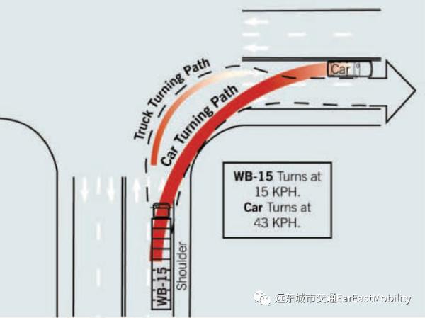 同样一个路口能够保证拖挂车以15公里时速过弯时,小汽车却能够行驶到43公里时速。如果转角设计只考虑这样的情况,那带来的道路交通安全隐患是很大的。