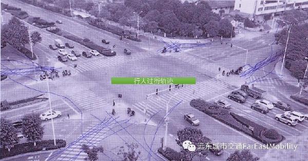 再看看行人过路口的情况……注意,很多人选择用最近的轨迹绕过渠化岛。