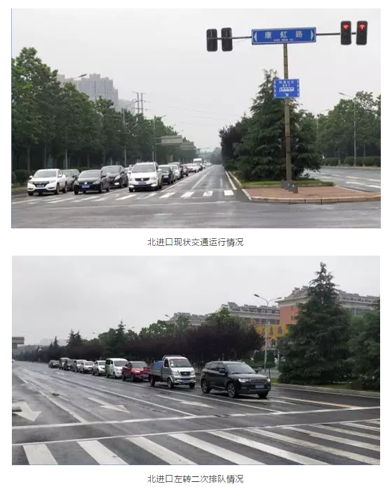 奥体中路为济南南北向重要主干道,承担着过境交通和集散交通双重功能,南北干线交通流高峰期间达3400pcu/h;康虹路为东西向次干道,是连接高新区与西部市区重要纽带。路口周边存在多种交通吸引点,高峰期间交通压力较大。早晚高峰期间北口左转进入康虹路车辆达600pcu/h,高峰期间二次排队达10辆,现状1条左转车道已无法满足左转交通需求,导致北进口车辆压车现象严重。
