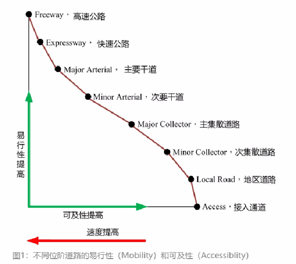 图1:不同位阶道路的易行性(Mobility)和可及性(Accessiblity)