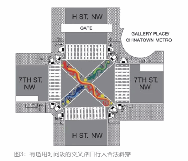 在某些情况下,为了保护行人,四个方向都是红灯,车辆全部停车,这个范围里只允许行人行走,并可以斜穿,称为Barnes Dance Intersection(巴恩斯舞路口),也就是在某时段内,行人在该路口内享有绝对路权(如图3)。