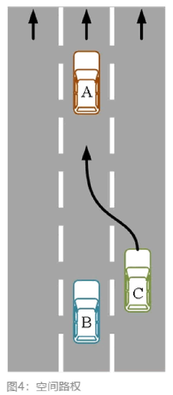 动态空间路权的判定比较复杂,有时必须与时间路权共同裁量,例如有时间限制的允许车辆左转;黄色虚线代表可以变换车道,但也要在虚线范围之内完成,这就是空间路权所规定的车辆可以行驶的长度;遇到红灯时,车辆前保险杠不能超越停止线,因为停止线是路权的界限,这就是空间路权的宽度。如图4所示,A、B两车在中间车道行驶,B车在A车后,如果此时C车突然变更车道造成事故,是B车的错还是C车的错呢?B车的路权长度为多少?事故鉴定需要把这些问题搞清楚。