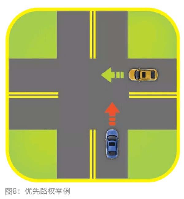 优先路权的规定背后是有原理的。图8中,在无信号灯路口,左方来车(蓝色车)为什么应让右方车辆(黄色车)先行?因为右方车辆的左侧有A柱遮挡,视线不清,左方车辆的视区条件相对较好。