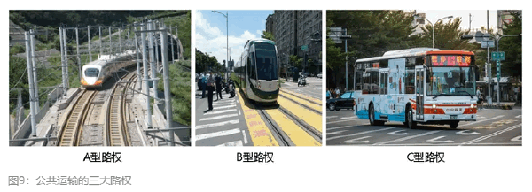 公共运输路权分为A、B、C三类:A型路权,是绝对专用,无平面交叉、无冲突点,例如高铁、地铁、高架BRT;B型路权,是绝大部分专用、少部分与其他系统共用,有部分冲突点,例如有平交道的传统铁路、城市轻轨等;C型路权,是指全路线与平面道路共享,例如公交车道。