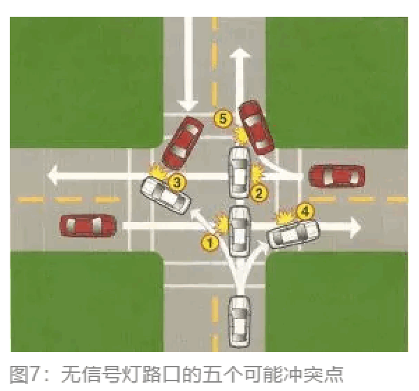 优先路权一定要在法规中明确规定,如果没有规定优先路权,路口四个方向的来车互不相让,到最后谁都不会得到好处。如图7所示,无信号灯路口的车辆冲突点有五个,解决这五个冲突点需要依靠优先路权的概念。